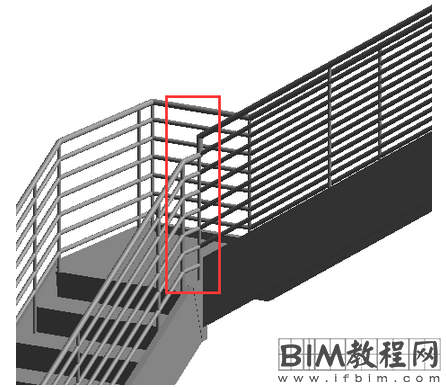 在绘制楼梯时,自动生成的栏杆扶手经常会出现如下图的连接方式,这个原因是因为未预留起始踏步距离造成的