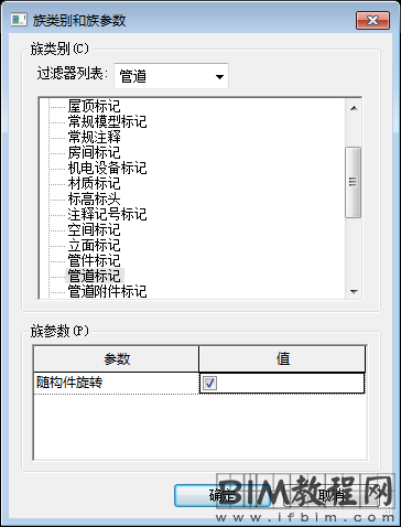 1.使用“公制常规标记.rft”模板新建一个族,点击打开族类别和族参数对话框,选择“管道标记”作为族类别,并勾选“随构件旋转”。勾选它的目的是使该标记一直与管道垂直,如图所示。