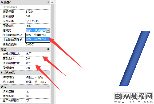 4. 将垂直柱改为斜柱,选择属性垂直柱把“柱样式”有垂直调整为倾斜-角度/端点控制,“顶部/底部斜面样式”有垂直调整为水平(图四所示)