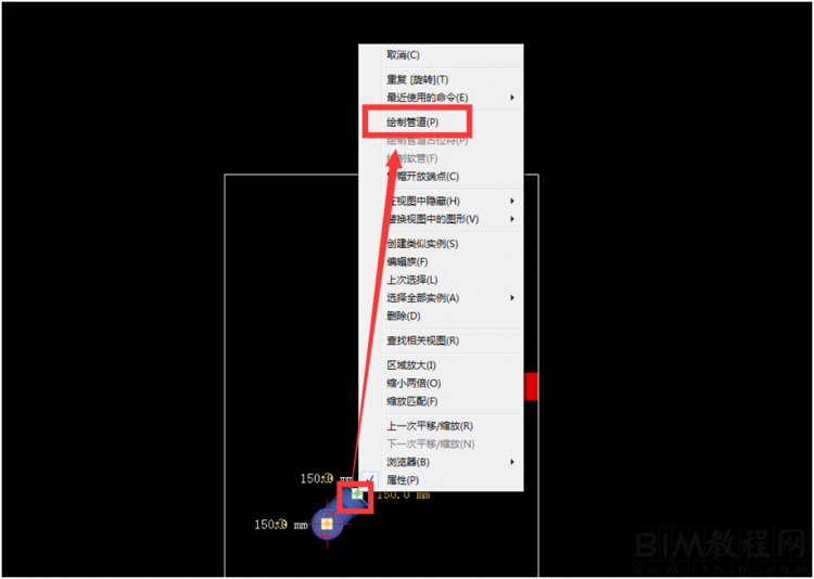 6、 仍然在剖面视图中,单击选中三通,在三通上“+”标志处右键,选择绘制管道。