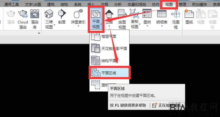 3. 点击“视图”选项卡下,点击“平面视图”下拉菜单中的“平面区域”命令,如图所示。