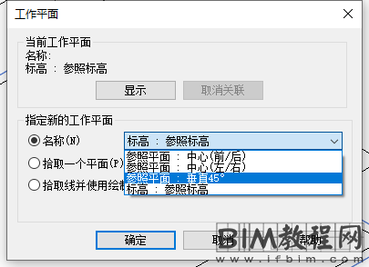 2、切换到三维视图,视觉样式选择“线框”,在“创建”选项卡下选设置工作平面,选择参照平面“参照平面:垂直45度",如图所示。