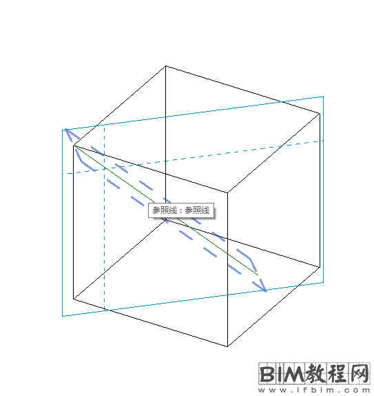 1、选择“公制常规模型”族样板,绘制一个正方体。切换到“参照标高”视图,绘制一条对角参照面,并命名为“垂直45度”,如图所示 。