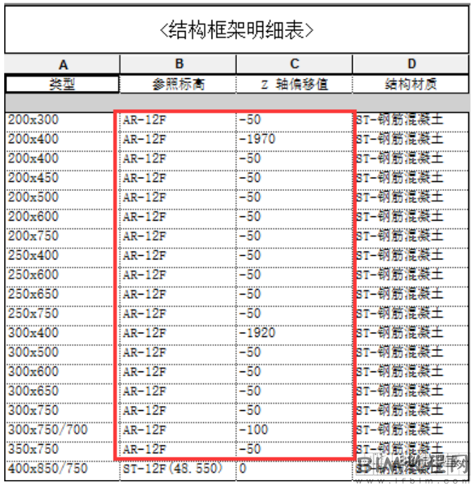 步骤五:本例中建筑、结构标高相差50mm,因此调整了梁的参照标高后其"Z轴偏移值"应在原来模型的基础上加上50mm,照此调整明细表中的"Z轴偏移值"的值即可;