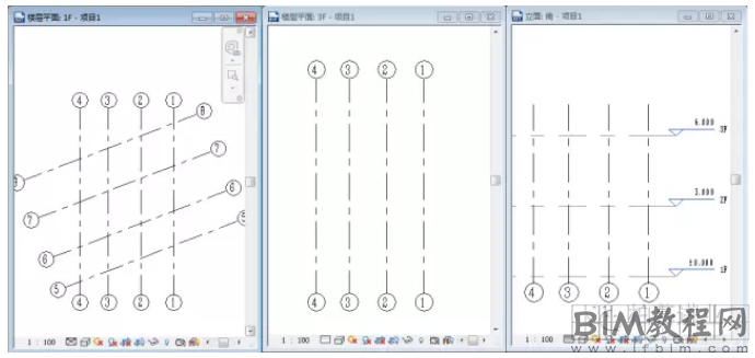 3)但是进入东、西立面会发现看不到轴网,原因是在Revit中只有与视图垂直的轴网才能在视图中显示出来。斜向轴网在东、西立面不可见。此时我们只需新建一个与轴网垂直的视图并进入视图拖动轴网即可。如图3、图4所示: