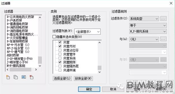3、风管以排风系统为例:风管的过滤条件也是系统类型,如图所示。