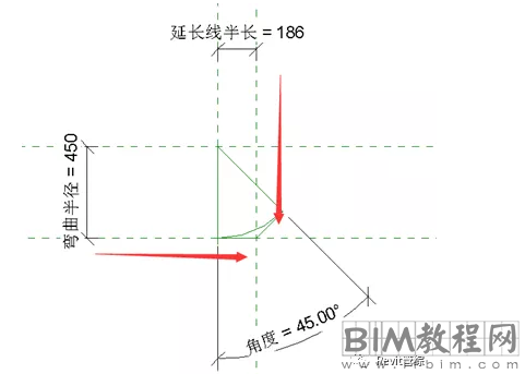 在算量时弯头计入延长线中的长度应是两侧至延长线交点的长度:
