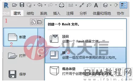 首先我们先绘制一个楼板边所需要的轮廓,点击软件左上角的文件选项卡,单击【新建】→【族】,如图: